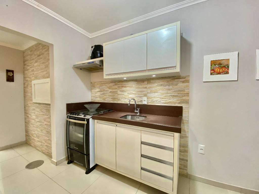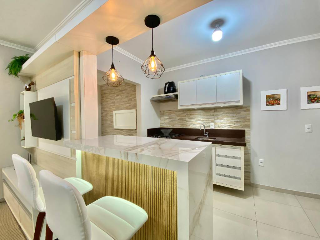 Amplo apartamento composto por 01 dormitório, living amplo de 2 ambientes (estar e jantar), banheiro social, totalmente mobiliado, ar condicionado instalado, cozinha com bancada americana, churrasqueira e lavanderia individual, uma ótima vaga de garagem térrea.