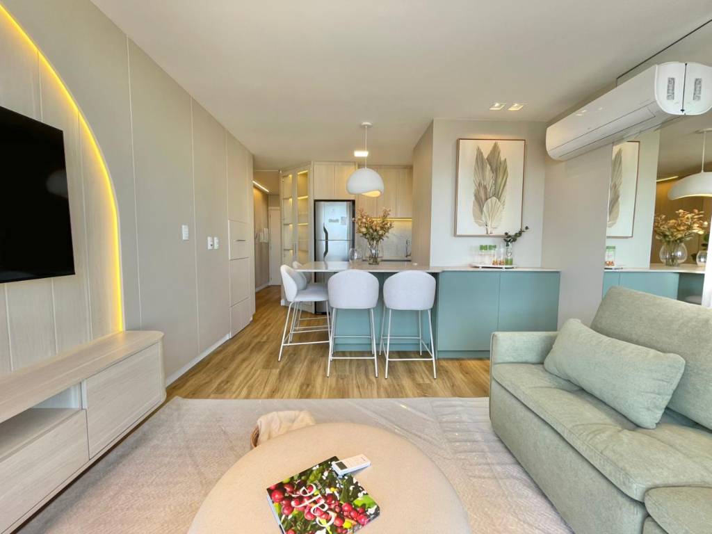 Este apartamento de 1 dormitório é finamente mobiliado e decorado, com ambientes planejados para aproveitar cada espaço com elegância. Conta com suíte americana, churrasqueira e Junker já instalado, garantindo conforto térmico o ano inteiro.