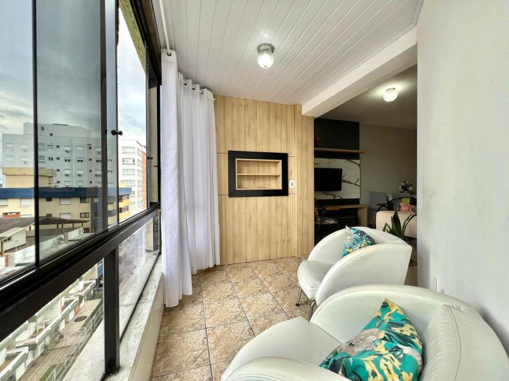 Sacada de frente, com vista para o Mar e sol da manhã, churrasqueira, todo mobiliado, living de estar amplo, cozinha e área de serviço, banheiro social, mais um belíssimo quarto bem ventilado e amplo.
