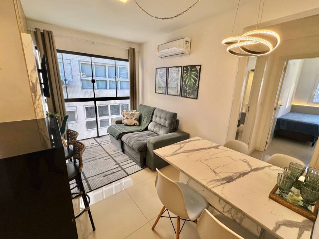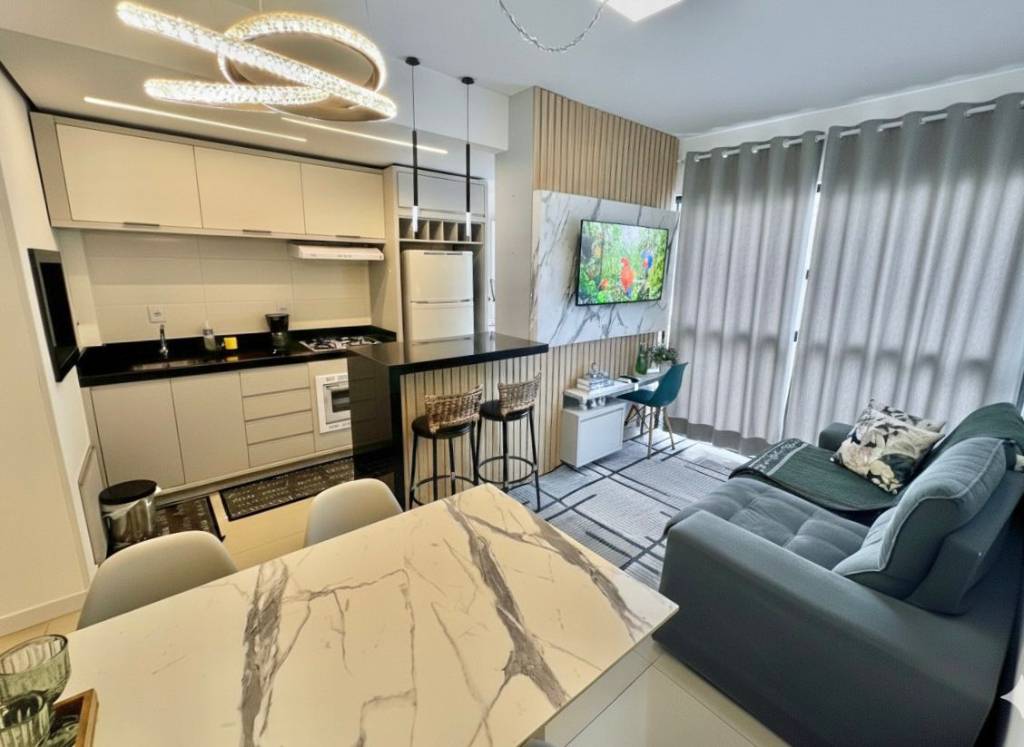 Apartamento de 2 dormitórios sendo 01 suíte, banheiro social, mobiliado e decorado, churrasqueira, cozinha americana, área de serviço separada, com água quente e gás central, hidrômetro individual, 01 vaga de garagem.