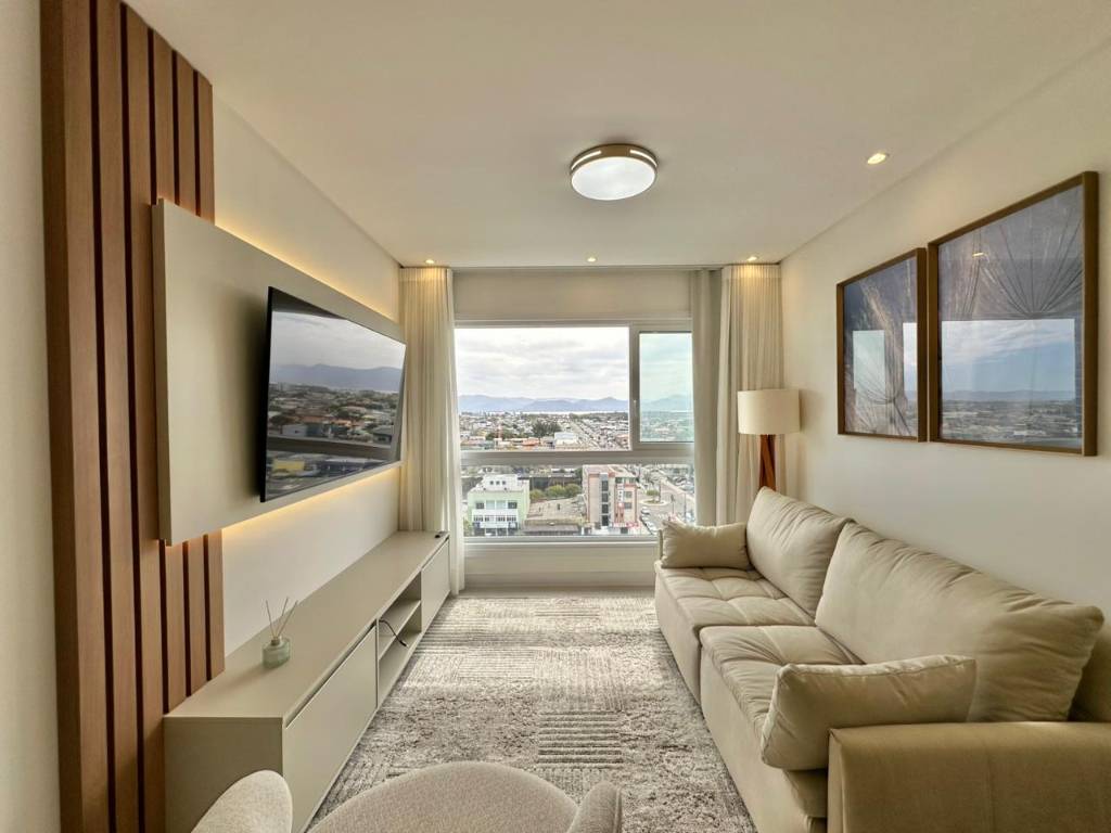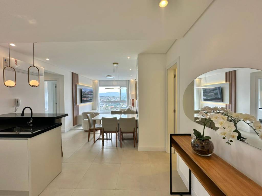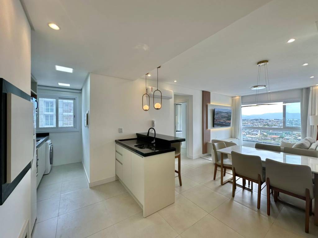 Apartamento de frente, novo, composto por 2 suítes, lavabo, totalmente mobiliado e decorado, pronto para uso, amplo living 2 ambientes, integrando sala de estar junto com sala de jantar, com uma vista panorâmica para a serra, cozinha americana, churrasqueira, área de serviços integrada e 1 box de estacionamento. Edifício de alto padrão, fachada revestida, hall de entrada decorado, 2 elevadores, gás central, hidrômetro individual, infraestrutura completa de lazer no rooftop (salão de festas, academia, piscina, pet place, espaço kids), portão e porteiro eletrônicos, zeladoria permanente. Localização privilegiada, infraestrutura com vista para serra e para o mar, próximo a todos os comércios. Agende hoje mesmo sua visita!