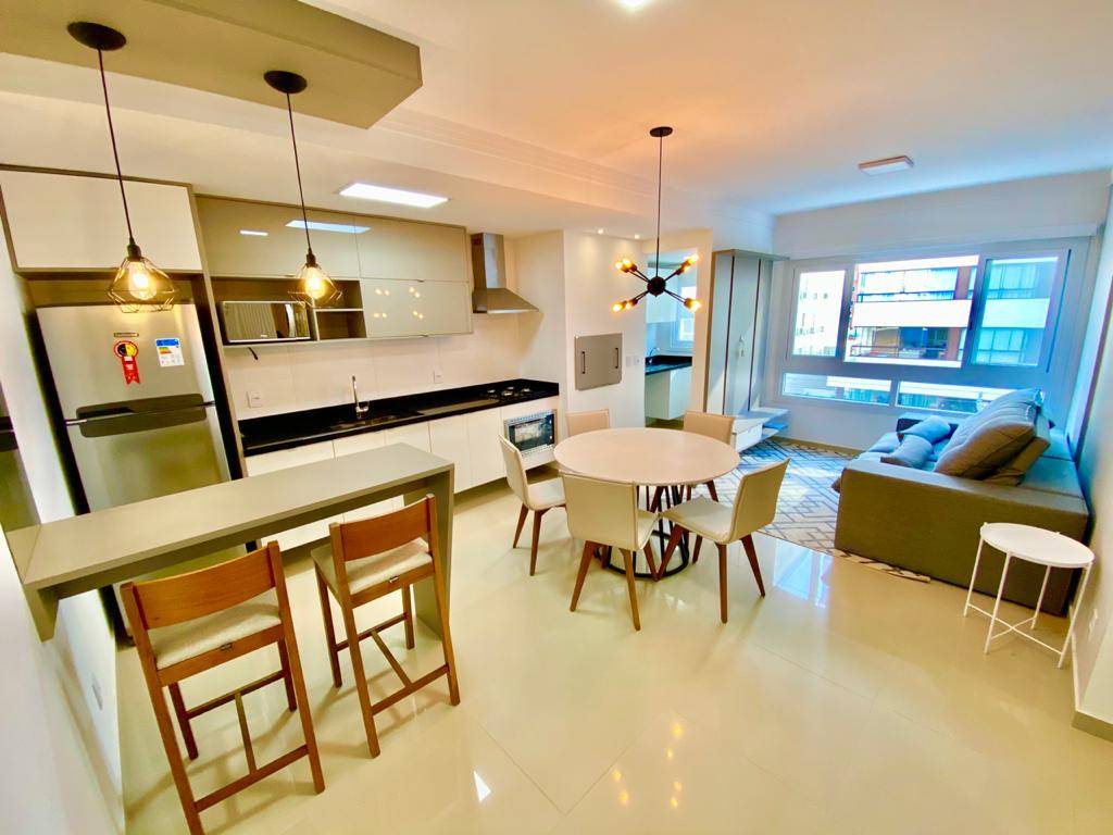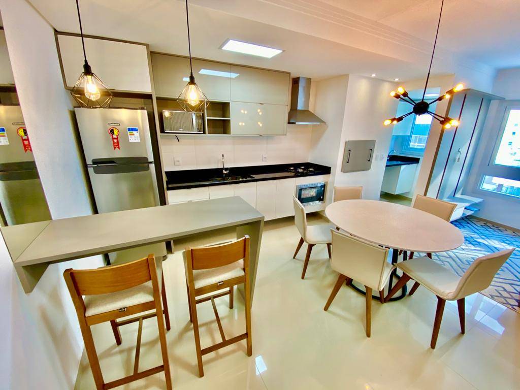 No bairro Navegantes, mobiliado e decorado, apartamento composto por 2 dormitórios, um suíte, novo nunca habitado, sacada de frente com vista liberada, living integrados em 02 ambientes estar e jantar, cozinha americana, área de serviço, churrasqueira, banho social, espera p/ splits, água quente, gás central, hidrômetros individuais e uma vaga de garagem. Edifício de alto padrão, fachada 100% revestida, elevadores digitais, hall de entrada decorado, salão de festas, piscina, porteiro e portão eletrônicos, zelador permanente, tudo isso junto à Avenida Ubirajara e a poucos metros do mar!