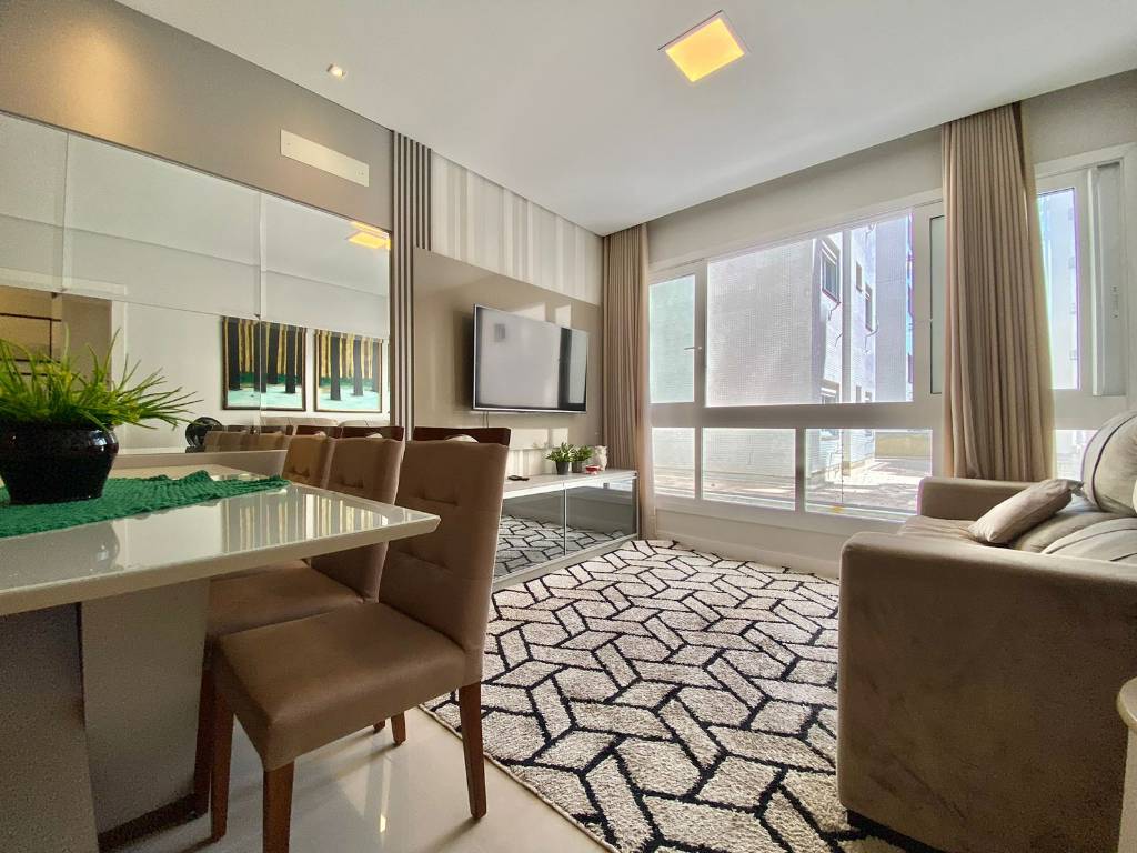 BAIRRO NAVEGANTES!!! Apartamento com 02 dormitórios, sendo uma suíte + banheiro social. Living integrado, sala de estar, sala de jantar, cozinha americana, churrasqueira e área de serviço separada. Imóvel está completamento Mobiliado e Decorado, posição solar Leste/ Norte, sol da manhã, 96m² de área total de apartamento, alto padrão construtivo, piso porcelanato, esquadrias em PVC, rebaixo em gesso, água quente e gás central e um box para estacionamento. Edifício novo, 100% pastilhado, Hall de entrada Decorado, salão de festas, localizado no Bairro Navegantes em frente a praça Tiaraju, à 03 quadras da Beira-Mar.