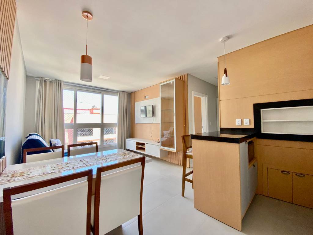 Apartamento com 61,42m² de área privativa, sendo dois dormitórios, uma suíte, banheiro social, sala de estar e jantar, cozinha e churrasqueira.