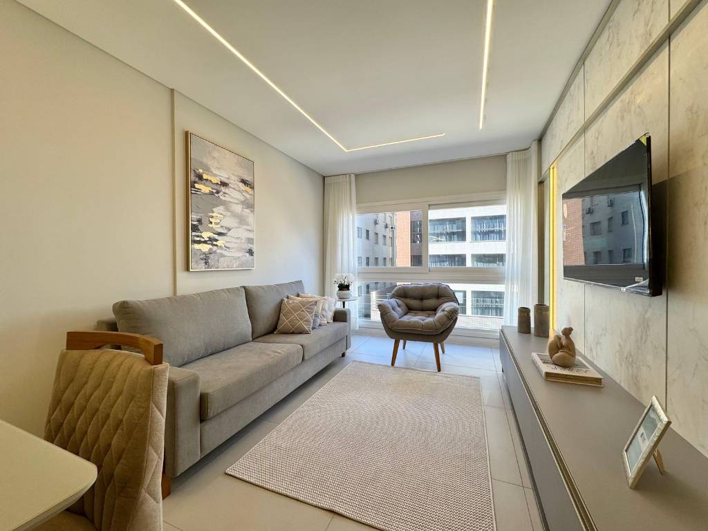 Apartamento de dois dormitórios, sendo uma suíte, cuidadosamente mobiliado e decorado, a poucos metros da praia. O imóvel apresenta um projeto moderno, que valoriza cada ambiente com elegância e funcionalidade. A área social integra sala de estar e jantar em perfeita harmonia com a cozinha planejada, criando um espaço convidativo para receber e viver momentos especiais.