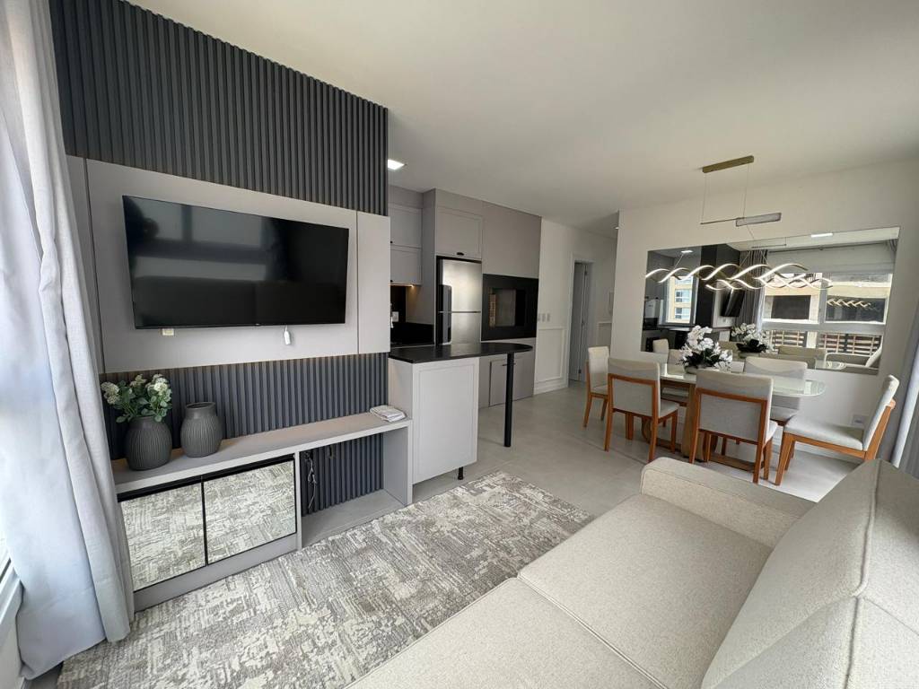 Apartamento novo de frente de alto padrão construtivo, composto por 2 suítes mais lavabo, living amplo e muito bem distribuído, integrando ambientes, sala de estar e sala de jantar, cozinha americana, área de serviço, de frente com vista panorâmica, completamente mobiliado, com terraço privativo, muito bem iluminado e ventilado naturalmente, abertura em PVC, junto com 1 box de fácil acesso. Edifício novo de alto padrão construtivo em um conceito neoclássico na fachada, hall de entrada decorado, elevador, rooftop com salão de festas, piscina com vista para o mar e um terraço com vista 360° para a cidade.