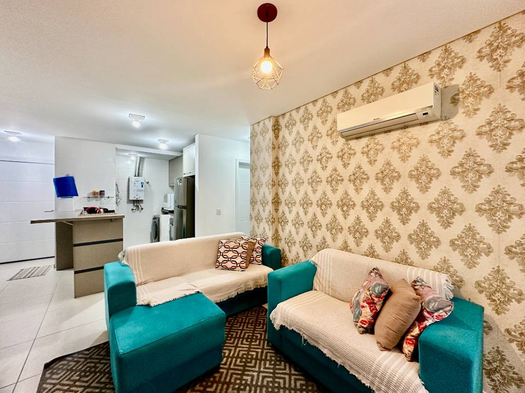 Apartamento totalmente mobiliado e equipado pronto para uso, composto por 2 dormitorios amplos, banheiro social, living integrando ambientes, sala de estar e jantar, cozinha estilo americana, area de serviço integrada, churrasqueira, andar alto, muito bem ventilado e iluminado naturalmente, junto com 1 box de facil acesso. Edificio de alto padrao construtivo, conta com hall de entrada decorado, elevador e zeladoria permanente o ano inteiro, localizado no bairro zona nova ficando apenas 1 quadra do mar!