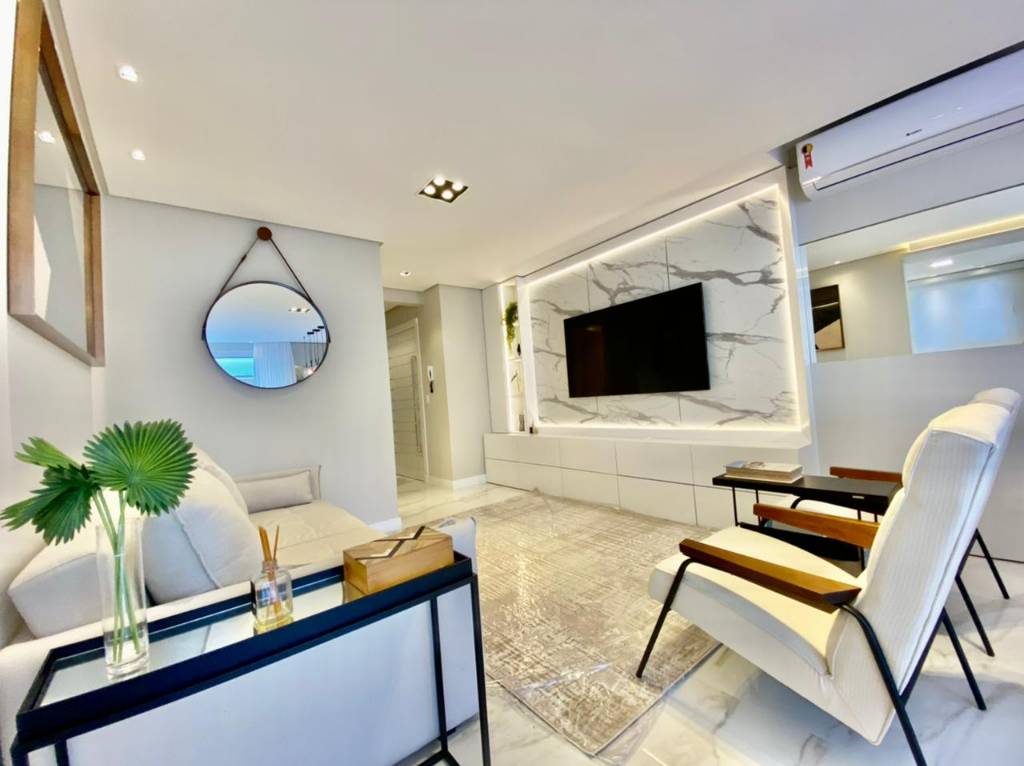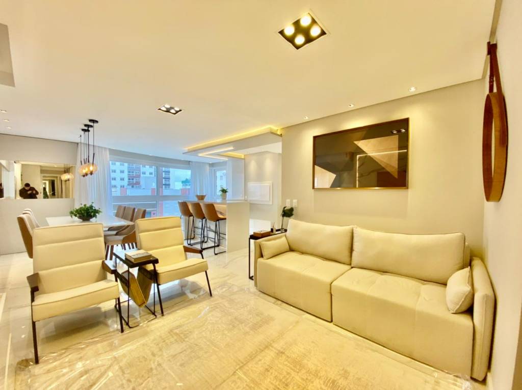 Finamente Mobiliado e Decorado de três suítes, mais lavabo. Cozinha americana, ampla área de serviço separada, amplo living 3 ambientes, com tudo que há de mais sofisticado e moderno. Situado no 7° andar, muito bem iluminado e arejado, sacada separada com churrasqueira, acabamento de mais alto nível. Todo em porcelanato polido, rebaixo em gesso, iluminação embutida, split em todas as peças. Projetado para pessoas que cuidam dos mínimos detalhes!