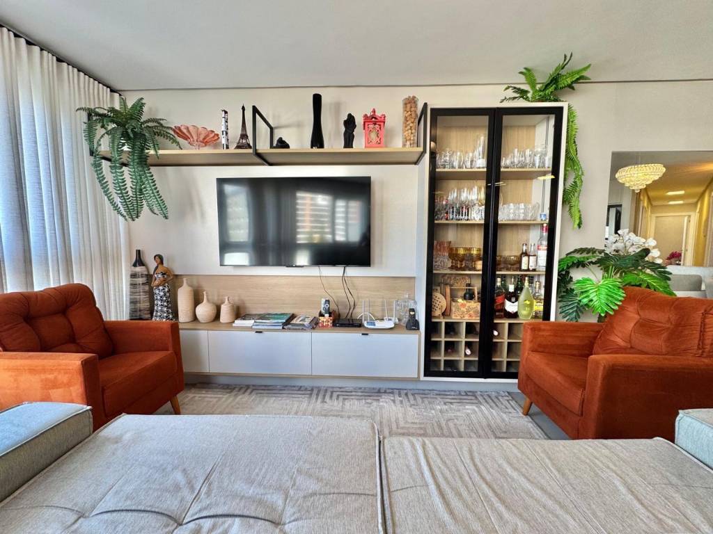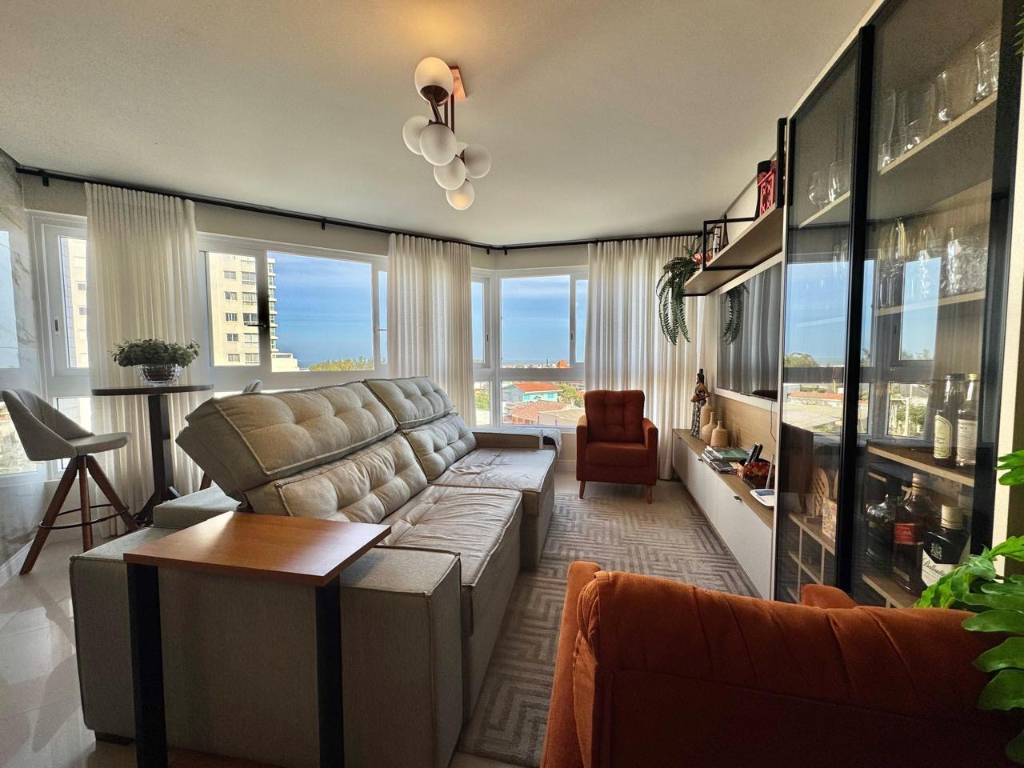 O imóvel possui living amplo e integrado, com sala de estar e jantar harmoniosamente distribuídos, grandes aberturas que garantem excelente iluminação natural e uma vista encantadora para o mar, além de sacada envidraçada, trazendo ainda mais conforto e sofisticação ao ambiente.