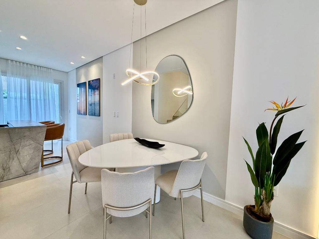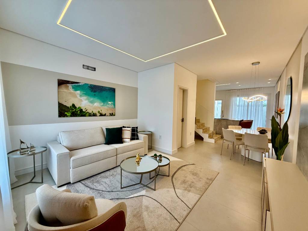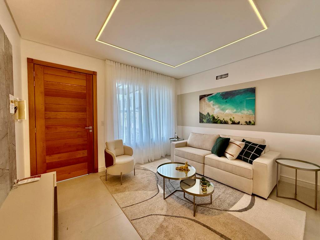 Sobrado com 120 m² privativos, distribuídos em 2 suítes, lavabo, living 3 ambientes, cozinha americana com churrasqueira, varanda na frente e nos fundos, área de serviços e estacionamento para 1 veículo.