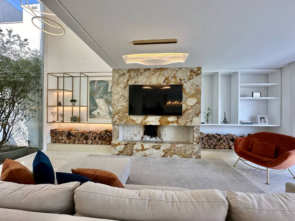Projeto com 220 m² distribuídos em 3 suítes (2 suíte são no andar de cima), living 3 ambientes com pé direito elevado, lareira, lavabo, cozinha americana, espaço gourmet com churrasqueira, área de serviços e abrigo para veículos.