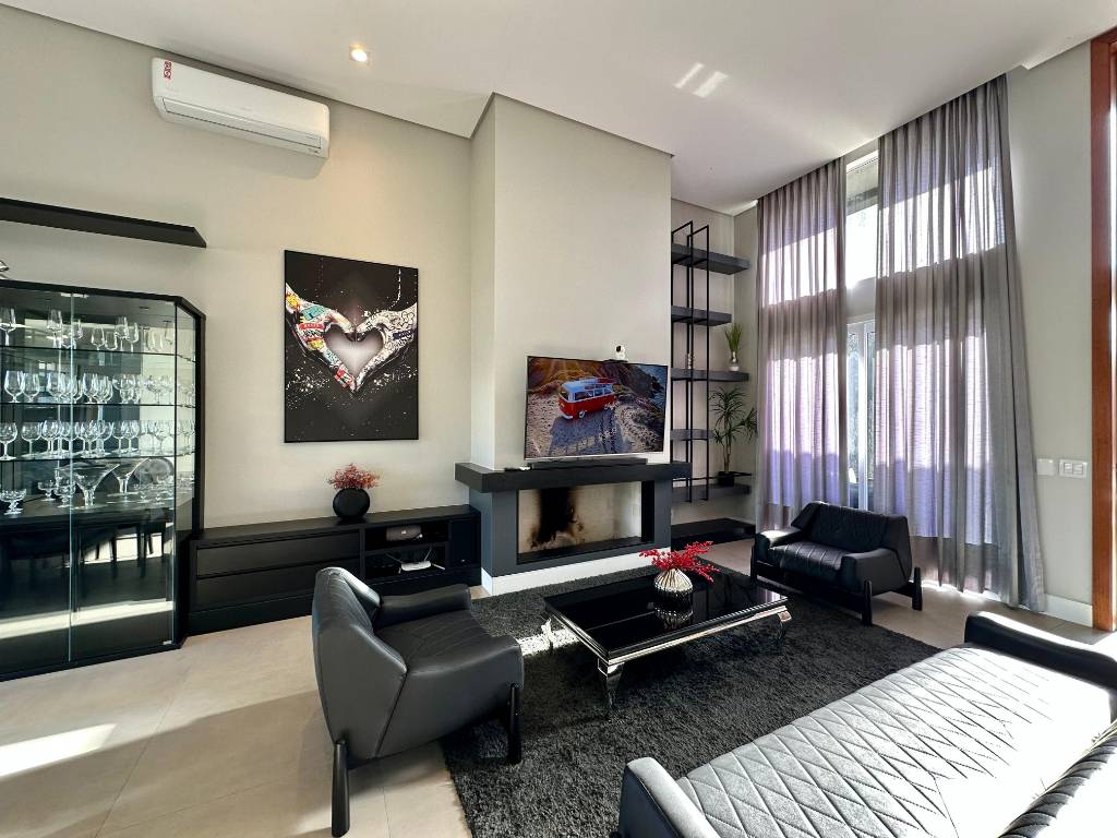 Conta ainda com lavabo, lavanderia separada e banheiro externo, proporcionando praticidade no dia a dia. O imóvel está totalmente mobiliado e climatizado, pronto para uso imediato, com acabamentos de alto padrão, piso em porcelanato, gás central e abrigo para carro.
