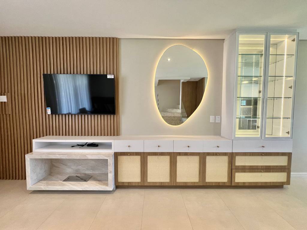Alto padrão construtivo: piso porcelanato, esquadrias em PVC e com telas mosquiteiras nos dormitórios, persianas automatizadas, esperas para splits, para água quente e para instalação de SPA, revestimentos em mármore travertino na escada e na churrasqueira e guarda corpo de vidro nas sacadas e escada.