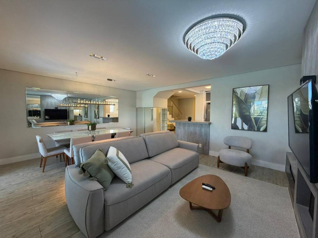 O living amplo integra estar e jantar de forma harmoniosa, com ambientes totalmente mobiliados e decorados, prontos para uso imediato. A residência conta ainda com cozinha independente, área de serviço separada, banheiro auxiliar e despensa, garantindo praticidade no dia a dia sem abrir mão da organização.