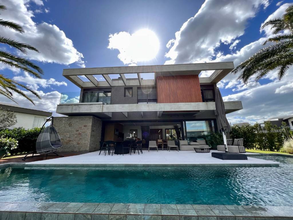 Luxuoso sobrado em localização nobre do condomínio Enseada, aqui em Xangri-la, ideal para quem valoriza conforto e sofisticação. São 4 suítes amplas, 3 delas com vista deslumbrante para o lago. O living imponente conta com lareira e pé-direito duplo, integrando sala de estar e jantar com paisagem panorâmica. O espaço gourmet é completo, com chopeira e detalhes em madeira nobre. Piscina em concreto com borda infinita, rodeada por jardim com paisagismo exuberante. Fachada moderna em concreto aparente e iluminação 100% em LED valorizam cada detalhe do projeto. Um imóvel único, pensado para quem busca exclusividade, elegância e contato direto com a natureza.