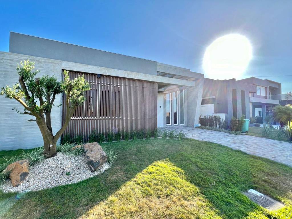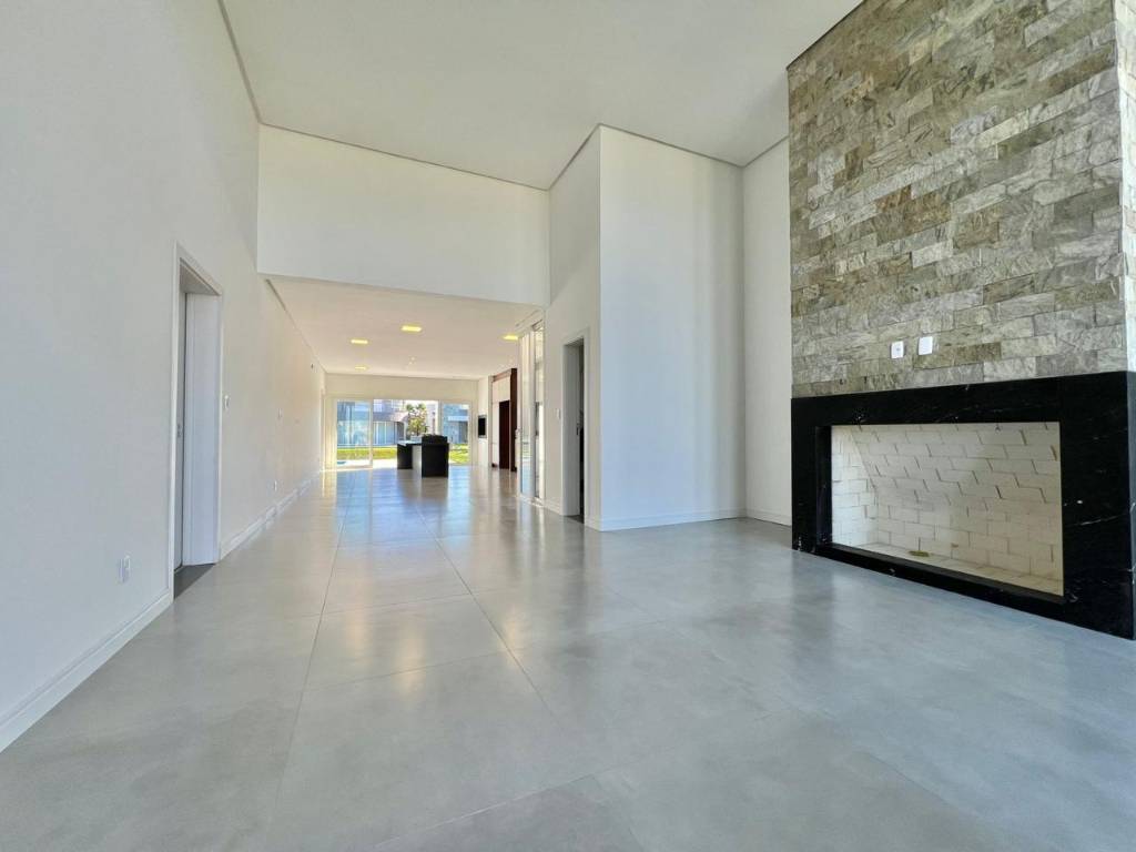 Casa nova recém entregue de alto padrão construtivo, composto por 4 suítes individuais, lavabo, living amplo e muito bem distribuído, sala com lareira e pé direito alto, sala de jantar, cozinha estilo americana com ilha, alguns moveis fixo ja instalado, area de serviço separada, piscina para lazer e conforto da família, fundos beira lago, churrasqueira, aberturas de alto padrão, espera para ar split em todos os ambientes, garagem para carro.