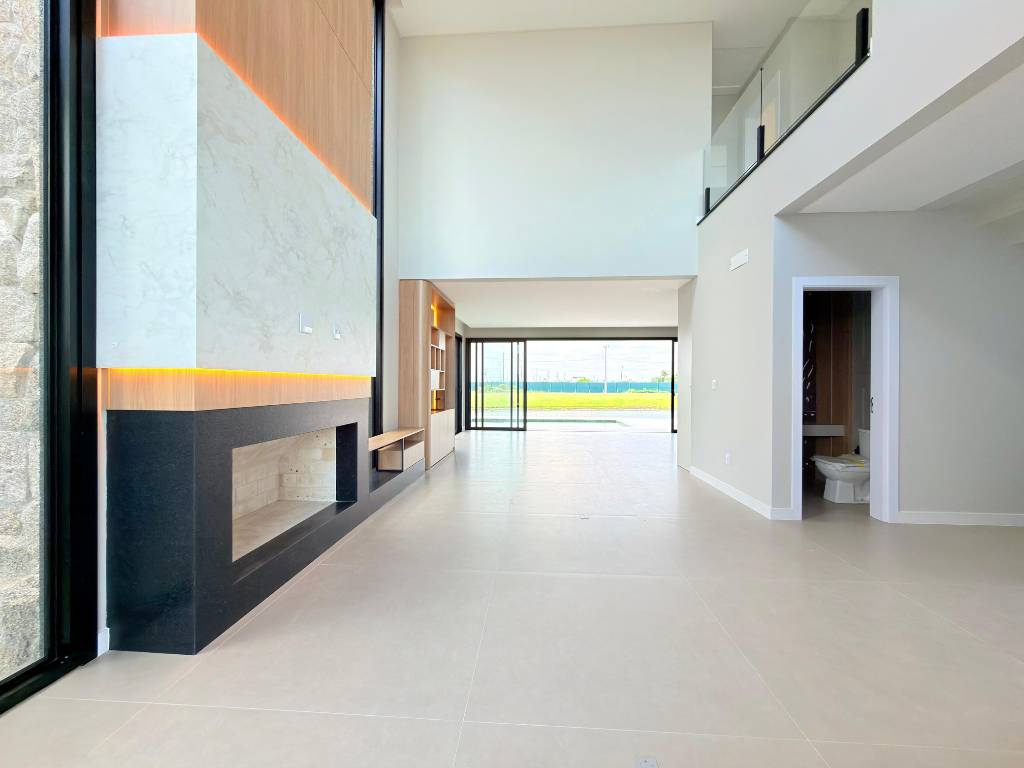 Sobrado de alto padrão com 250,93 m², distribuídos em 4 suítes, 2 lavabos e banho social. Living integrado com lareira, esquadrias pretas em alumínio, teto com rebaixo em gesso e excelente padrão construtivo.