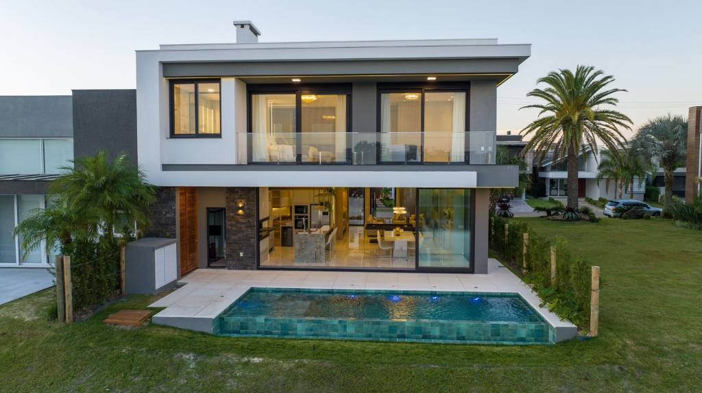 Excelente sobrado à venda no condomínio Capão Ilhas Resort!!! Casa possui 05 amplas suítes, sendo uma delas térrea e outra suíte master, com closet e banheira para duas pessoas com vista para o lago. O imóvel conta com 350 m² de área construída, amplo living de 5 ambientes integrados, sala de estar com pé direito duplo e lareira, sala de jantar para 10 pessoas, bar aberto, espaço gourmet integrado à cozinha 100% equipada, com o acréscimo de uma chopeira e churrasqueira automatizada. Aos fundos, esse sobrado está localizado à beira do lago, na quadra principal do condomínio, a poucos metros do clube principal, resultando em um lindo pátio com piscina de concreto, aquecida e vista panorâmica. O imóvel está 100% mobiliado, decorado e equipado, posição solar frente norte, com fundos sul, pegando bastante ventilação na fachada e bastante sol na piscina à tarde. Venha conhecer esse belíssimo sobrado à venda no condomínio Capão Ilhas Resort.