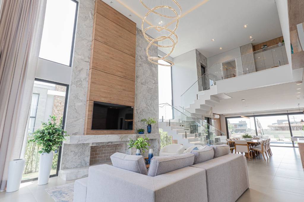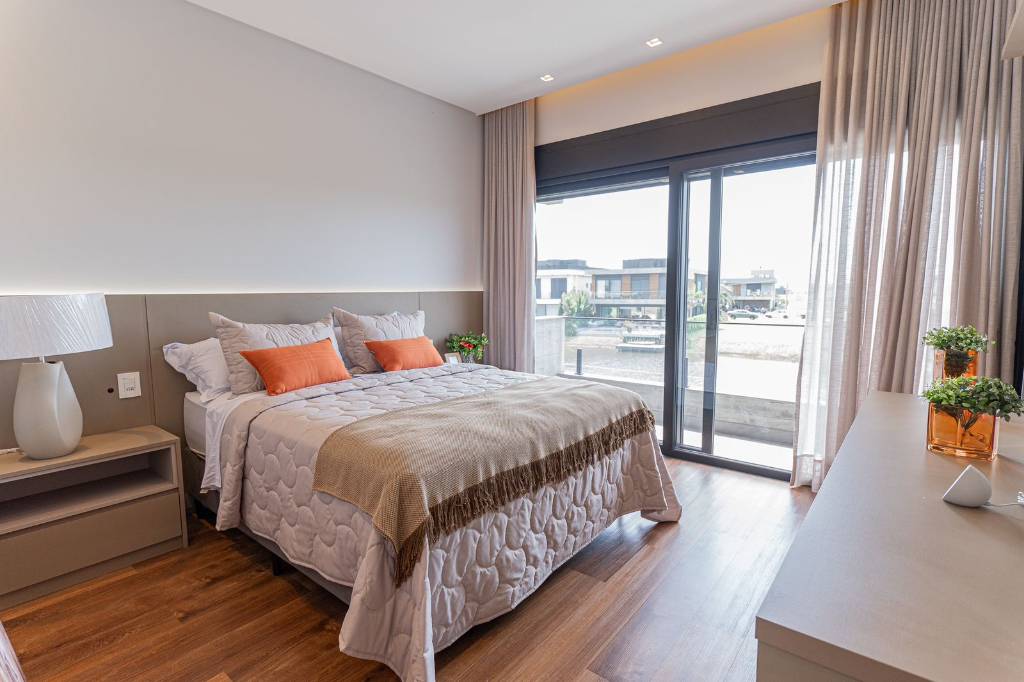Este sobrado de 418m² de área privativa oferece 5 suítes, sendo uma no térreo, além de duas salas de estar com lareira, adega para vinhos, elevador e espaço gourmet com churrasqueira e choppeira. A área externa conta com uma piscina em concreto, com borda infinita à beira do lago. Sua posição solar com fundos para o nordeste garante sol na piscina durante todo o dia, valorizando ainda mais os momentos de lazer. O imóvel inclui dependência de empregada, piso aquecido nos banheiros, automação completa e som na área gourmet. A suíte master oferece um amplo closet e uma vista privilegiada para o lago.